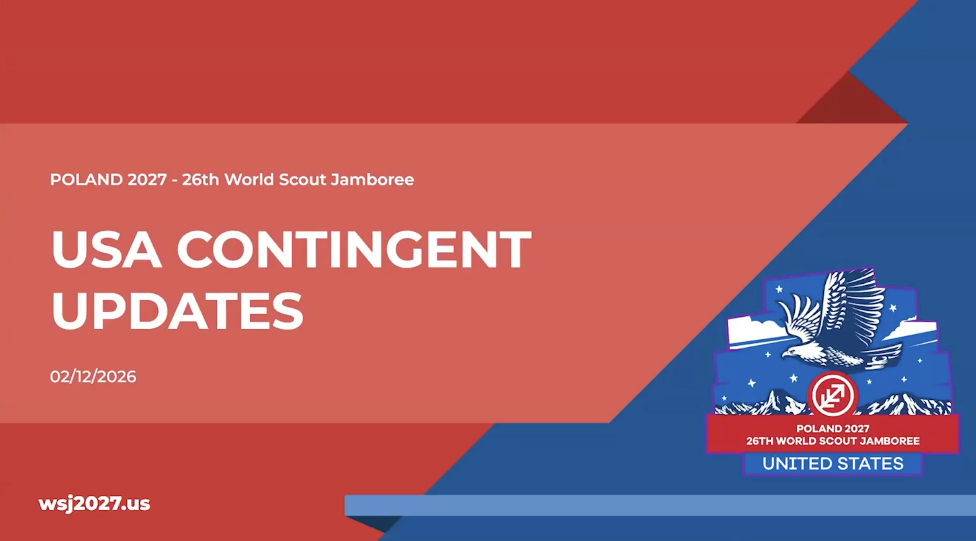 The USA Contingent CMT hosted the second Town Hall in February 2026 to discuss key details and provide updates on its preparations for the 26th World Scout Jamboree (WSJ), which will take place in Poland in 2027. The meeting agenda includes: